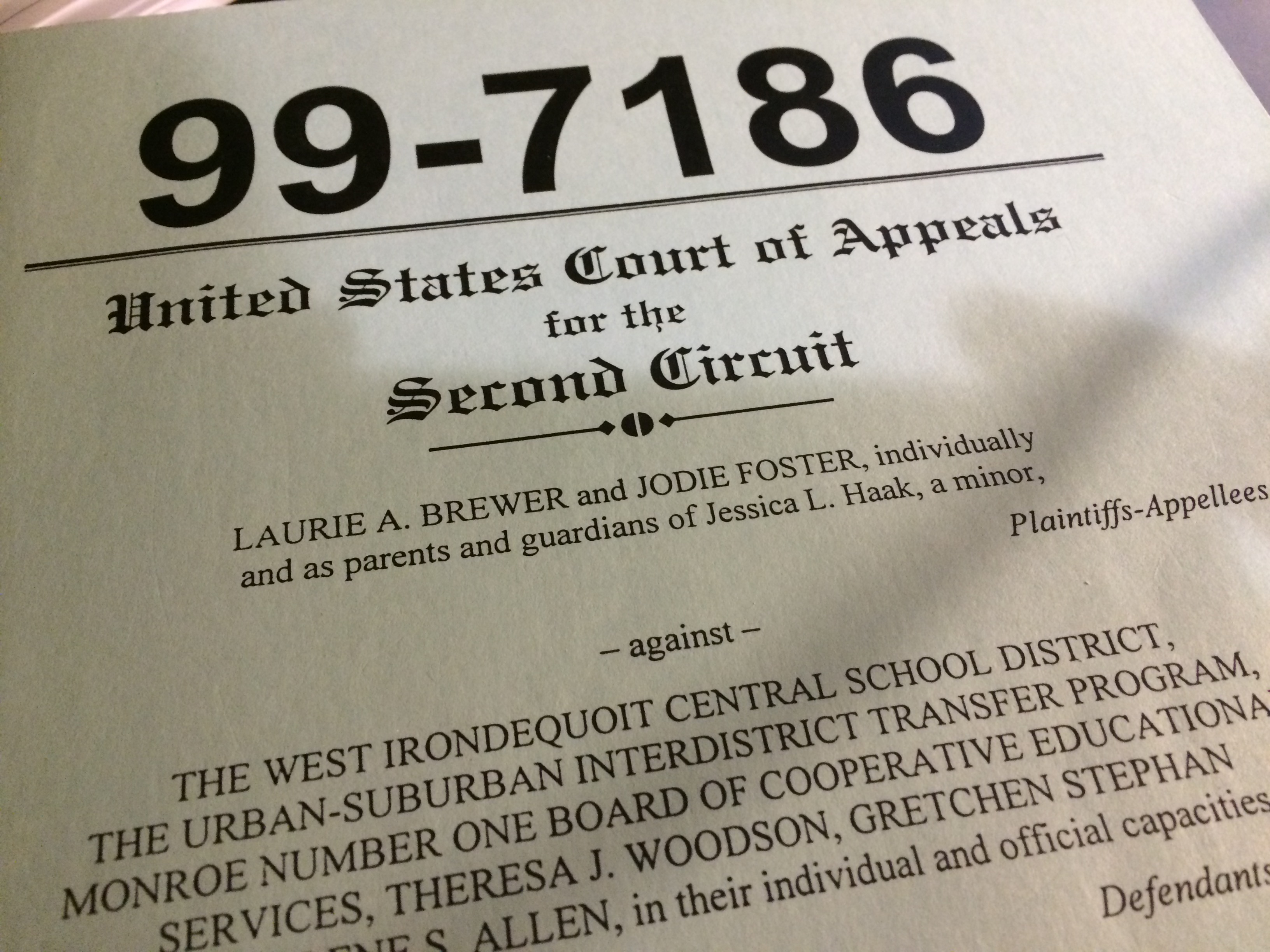 One of the most rewarding cases I worked on early in my career was Brewer v. West Irondequoit Central School District, 212 F.3d 738 (2d Cir. 2000), a case upholding the Urban-Suburban Interdistrict Transfer Program. This evening, I dusted off my copy of our brief, and flipped through the pages of the Joint Appendix. Here are some interesting facts from the case as they existed at the time of the appeal: